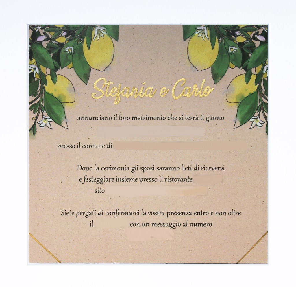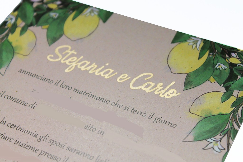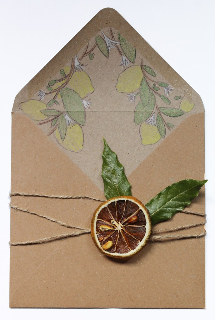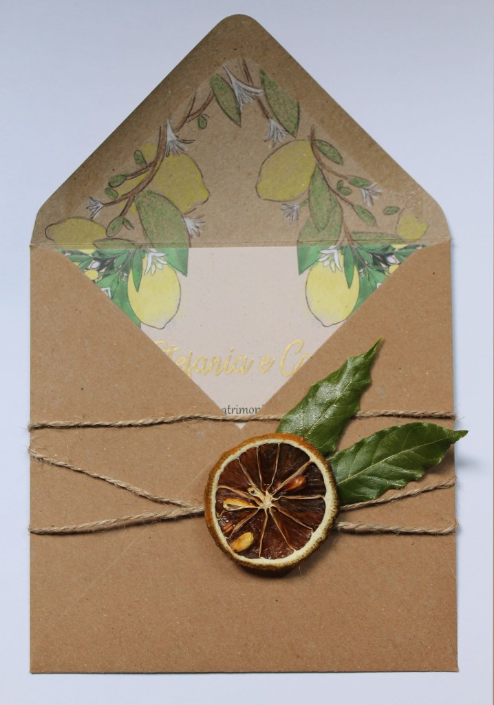Gli inserti dorati, i nomi e le linee sui bordi, sono stati realizzati a mano così come i disegni all’interno sulle buste che danno un senso di continuità. Il decoro sulle buste è stato realizzato facendo essiccare in forno alcune fette di limone, che successivamente sono state incollate insieme alle foglie su di uno spago.