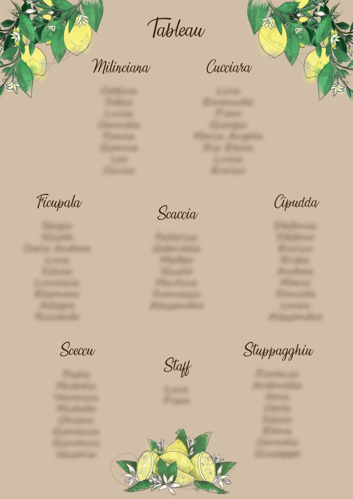 Per il tableau de mariage ed i segna tavolo ho utilizzato lo stesso colore delle buste che poi ho impreziosito con dettagli dorati realizzati a mano (vedi il video). I tavoli al ricevimento hanno i nomi di oggetti, animali e piante in dialetto siciliano.